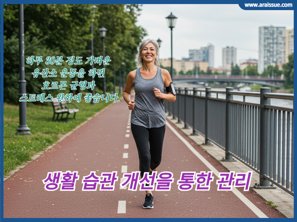 - 하루 30분 정도 가벼운 유산소 운동을 하면 호르몬 균형과 스트레스 완화에 좋습니다.