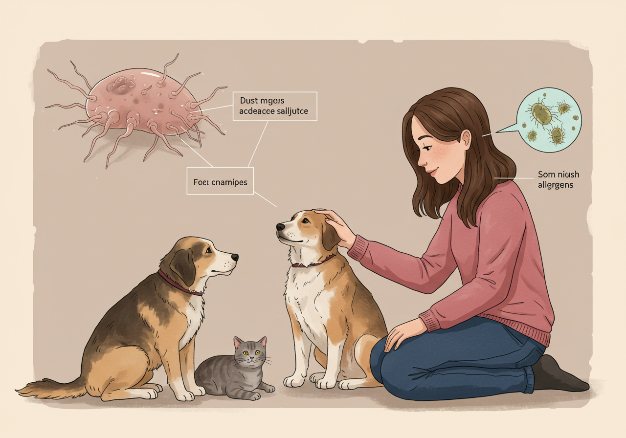 주로 동물의 털, 비듬(각질), 타액, 그리고 소변 등에 포함된 단백질 이 알레르기 반응을 유발하는 것입니다.