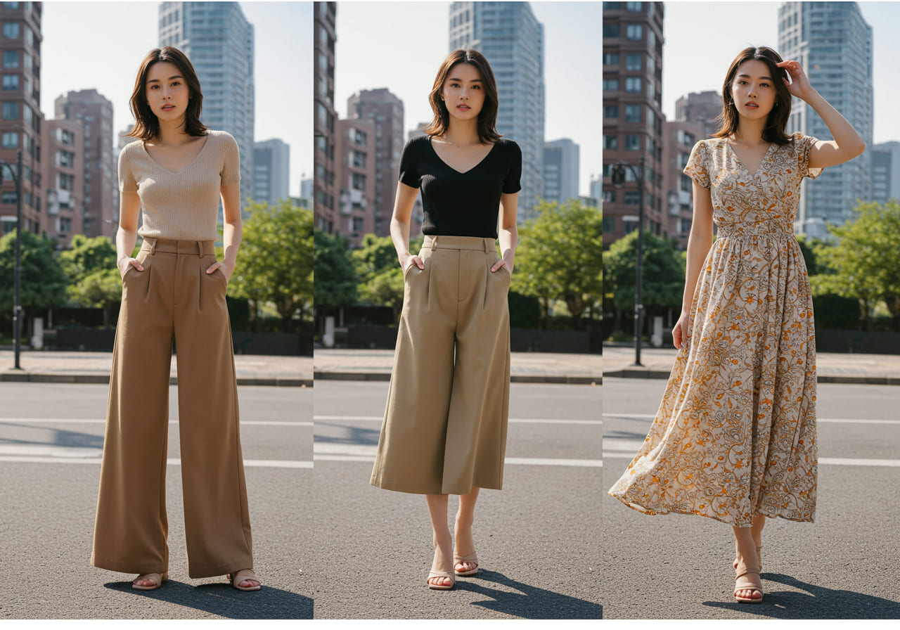 와이드 팬츠나 플레어 스커트를 선택하면 보다 자연스럽고 우아한 실루엣을 연출할 수 있답니다.