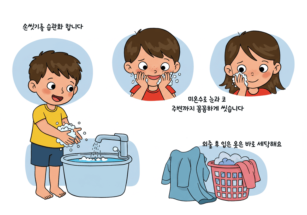 외출 후에는 반드시 손과 얼굴을 깨끗이 씻기는 것이 중요합니다.